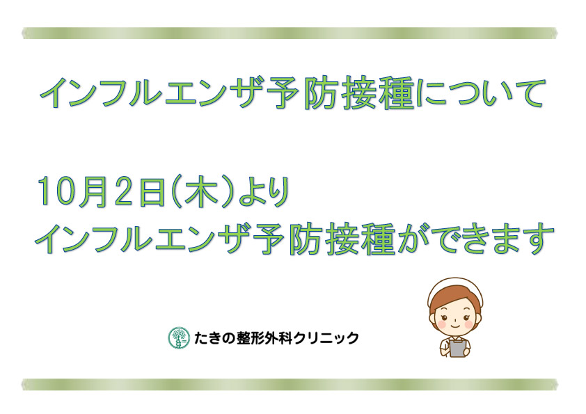 10月2日(木)よりインフルエンザワクチンの予防接種を受付致します。